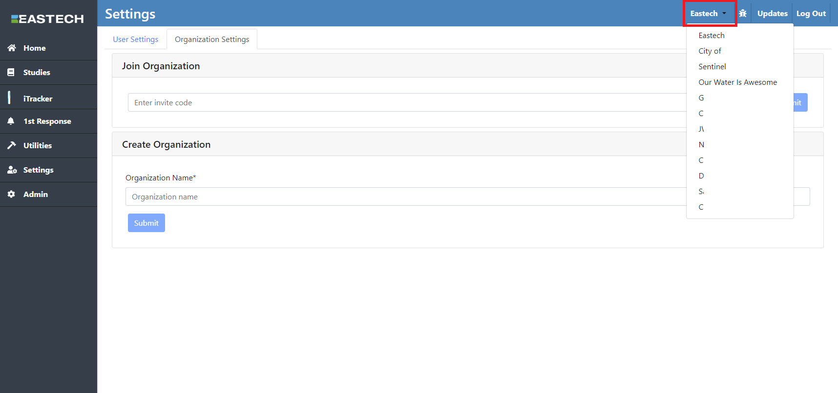 You may switch between any of your organizations by clicking the dropdown and selecting the organization you would like to view.