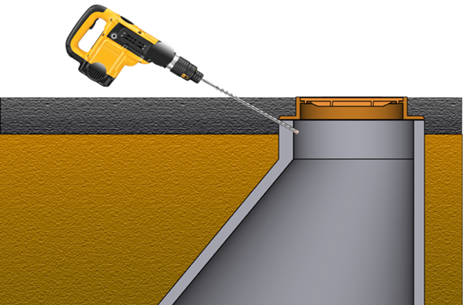 • Using the rotary hammer drill, drill an access hole from the street to a point beneath the manhole collar at approximately a 45-degree angle.